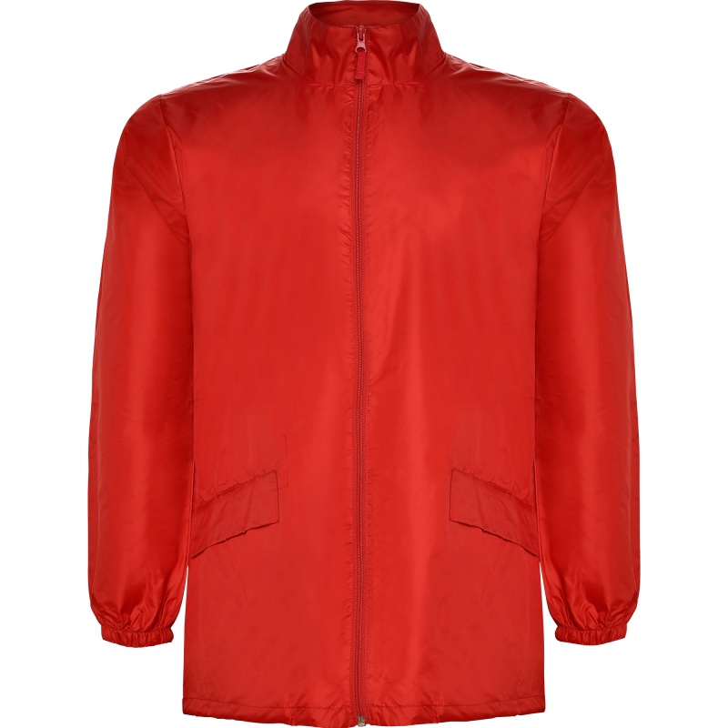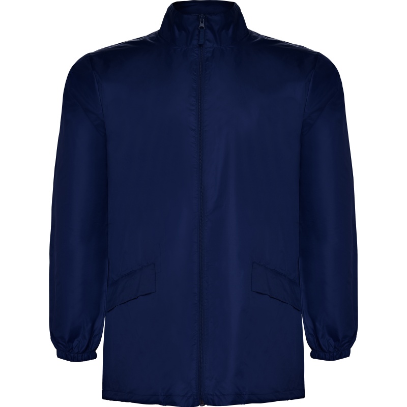High neck raincoat with full zip. 1.- Zipper. 2.- Hem with adjustable drawcord and stoppers. 3.- Foldable hood with drawcord in collar. 4.- Two flap pockets. 5.- Elastic cuffs. 6. -Elastic strap inside the pocket for folding and storage.