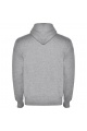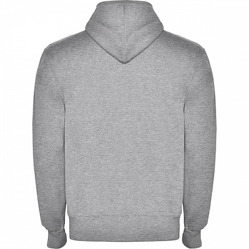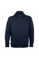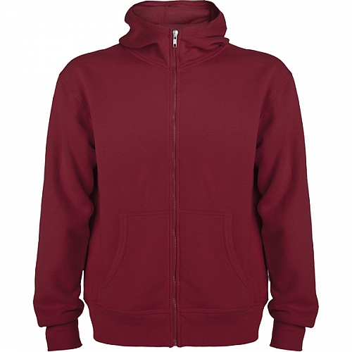 Sweat hooded jacket with high neck and full zip. Ribbed detail in hood and pocket piping. Kangaroo style pocket. 2x2 rib in cuffs and waist.