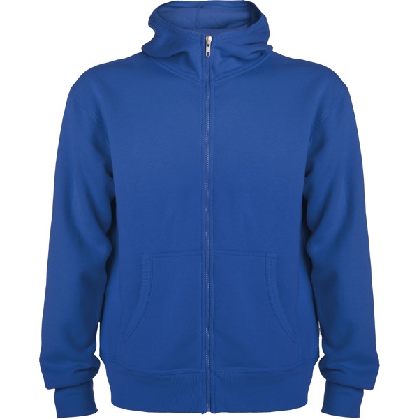 Sweat hooded jacket with high neck and full zip. Ribbed detail in hood and pocket piping. Kangaroo style pocket. 2x2 rib in cuffs and waist.