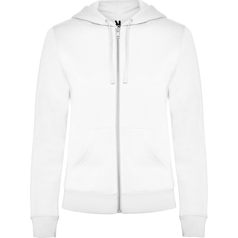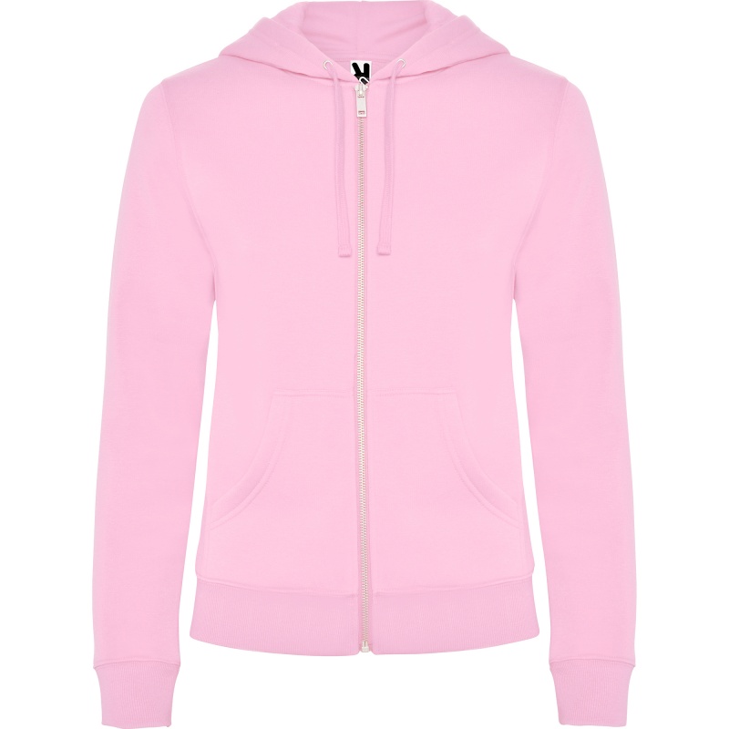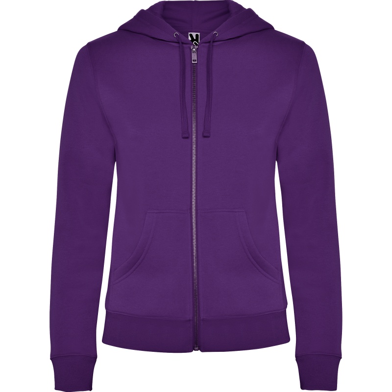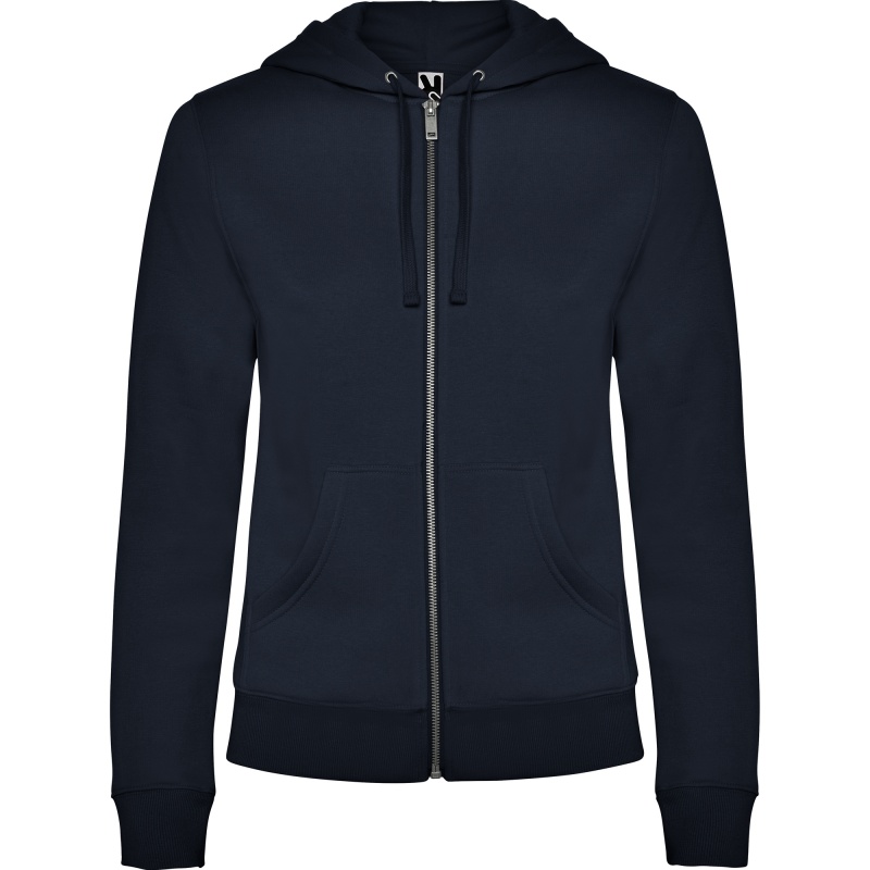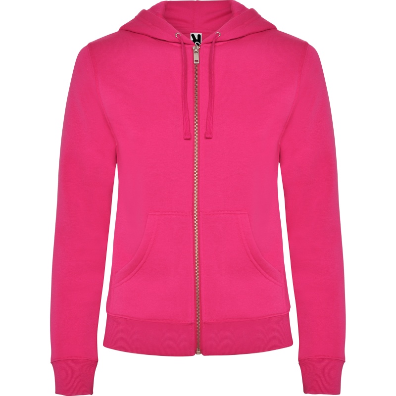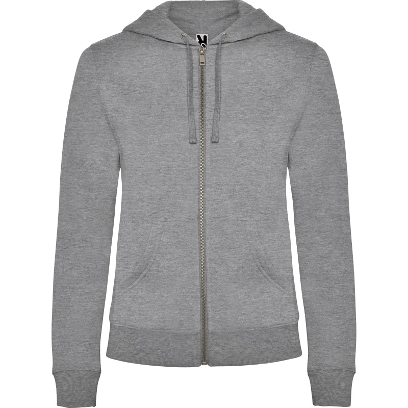 Women's sweat jacket with matching hood lining. 1.- Front metal zip. 2.- Kangaroo style pocket. 3.- Reinforced covered seams on inner collar. 4.- 2x2 ribbed knit in cuffs and waist. 5.- Fitted-cut. COMPOSITION 50% cotton / 50% polyester, brushed fleece, 280 gsm. Heather grey 58: 55% cotton / 40% polyester / 5% viscose.