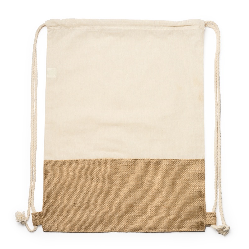 Eco drawstring backpack made of 120 gsm cotton and jute in natural colour, with a section of jute on the lower part of the front side. Drawcords sewn to both lower corners.
