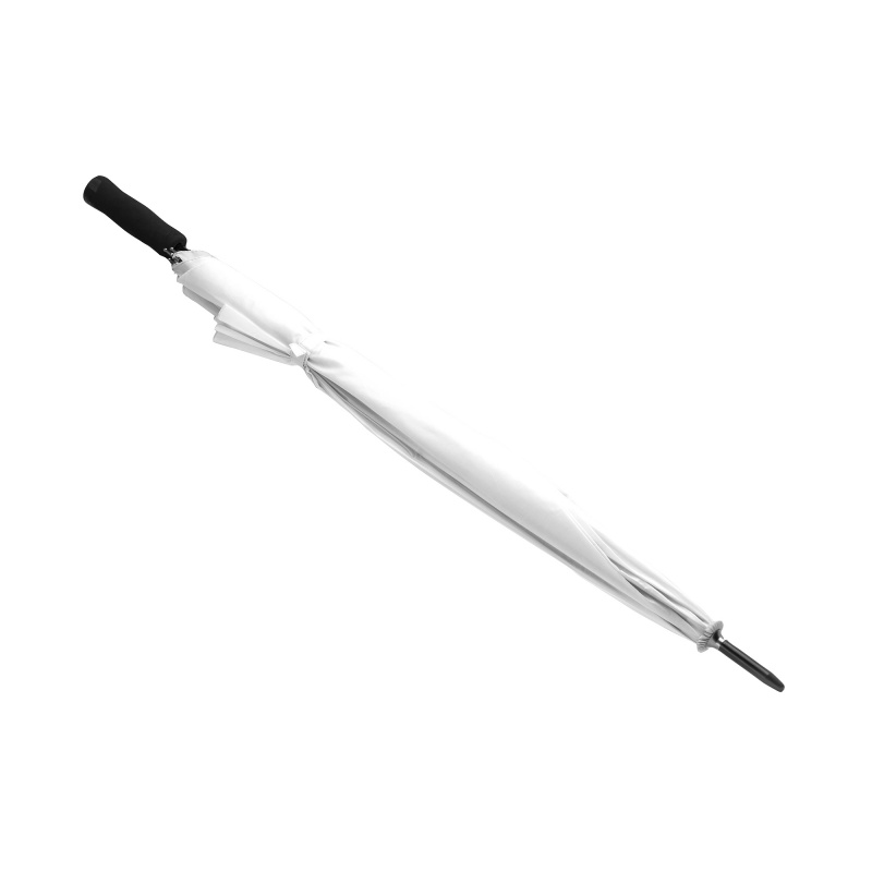 XL umbrella with handle, shaft and tips in black. Long fiberglass ribs. Auto-opening button. EVA handle. Colour matching velcro fastening. 130 cm diameter.