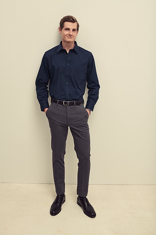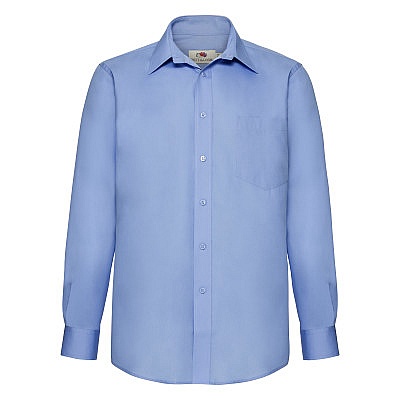 Standardowy kołnierzyk i kieszeń na piersi z tego samego materiału. Guziki w kolorze koszuli.