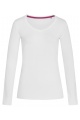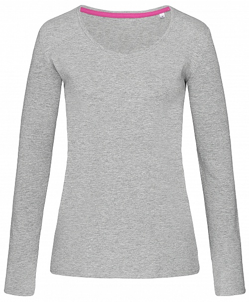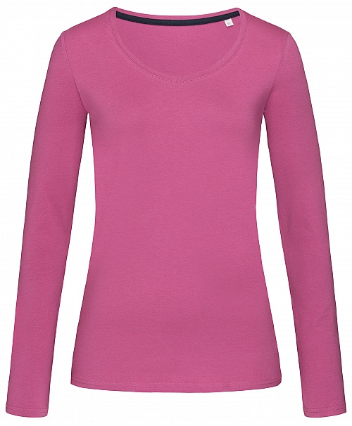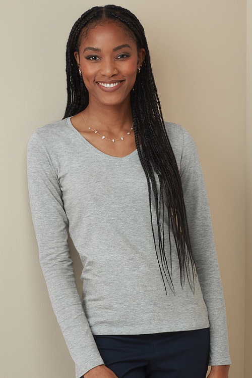 Dopasowany T-shirt z długimi rękawami dla kobiet, o modnej długości, wykonany z miękkiej i połyskliwej mieszanki bawełny i elastanu, z trójkątnym dekoltem i taśmą w kontrastującym kolorze na karku.