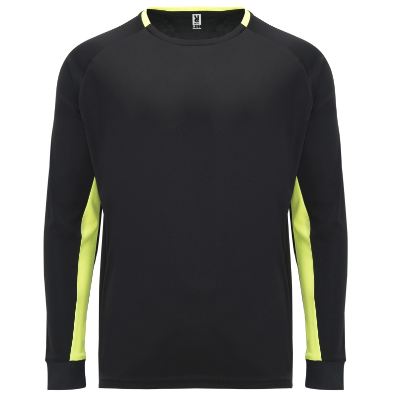 Bluza bramkarska unisex. 1. Długi rękaw, wyposażona w specjalne gąbki na łokciach. 2. Kontrastowe panele w rękawach. 3. Wewnętrzna kontrastowa wstawka na karczku i mankietach.