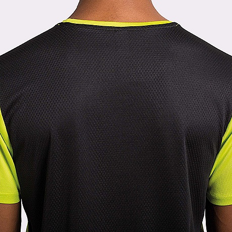 Koszulka techniczna z krótkim rękawem. 1.- Okrągły dekolt. 2.- Połączenie dwóch materiałów polistrowych. 3.- Główna tkanina o strukturze plastra miodu, tylnia część wykonana z oddychającej siatki 3D. 4.- Tkanina przygotowana do absorpcji wilgoci. 5,- Zigzag dekoracyjne szwy na ramionach i bokach. 6,- Delikatnie wydłużony tył.