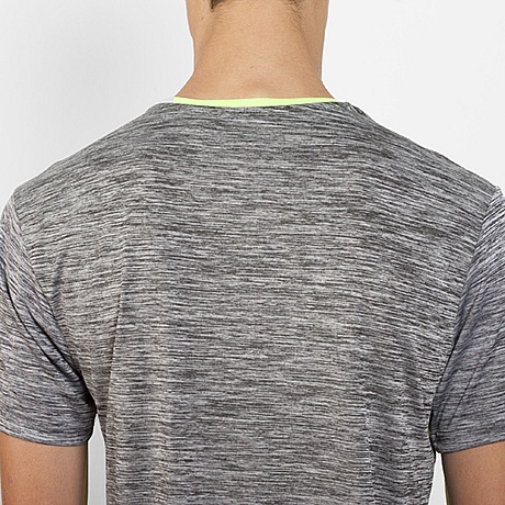 Koszulka techniczna z krótkim rękawem. 1,- Okrągły dekolt. 2.- Połączenie dwóch materiałów poliestrowych. 3,- Główna tkanina o strukturze bird´s eye, tylna część wykonana z Space Dye. 4.- Delikatnie wydłużony tył.