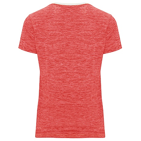 Koszulka techniczna z krótkim rękawem dla kobiet. 1. Okrągły dekolt. 2. Połączenie dwóch materiałów poliestrowych. 3. Główna tkanina o strukturze bird´s eye, tylna część wykonana z Space Dye. 4. Delikatnie wydłużony tył.