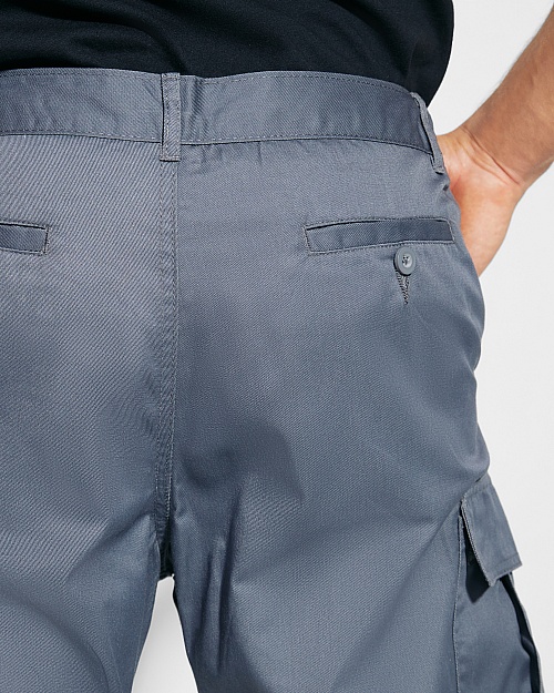 Szorty. 1.- Ściągacz regulowany w pasie. 2.- Dwie przednie kieszenie. 3.- Dwie boczne kieszenie z zapinane na rzep. 4.- Dwie tylne kieszenie zapinane na guzik.