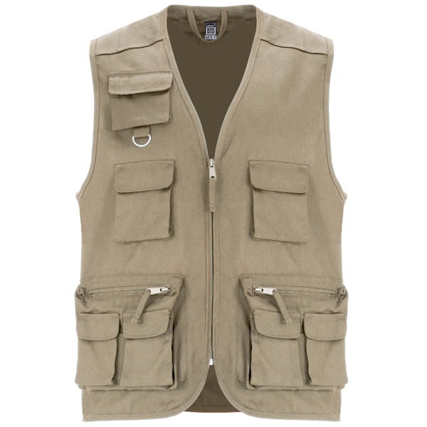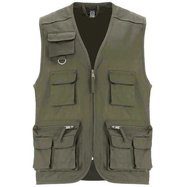 Kamizelka robocza z wieloma kieszeniami: 1. Centralny zamek z uchwytem. 2. Dekolt V-neck. 3. Trzy kieszenie na piersi z klapką i zapięciem na rzep. 4. Górna kieszeń z pierścieniem wielofunkcyjnym. 5. Dwie boczne kieszenie zapinane na suwak i dwie kieszenie z klapami i zapięciem na rzep. 6. Dwie tylne kieszenie z klapką i zapięciem na rzep. 7. Dekolt, rękawy i dół wykończene elastycznym ściągaczem.