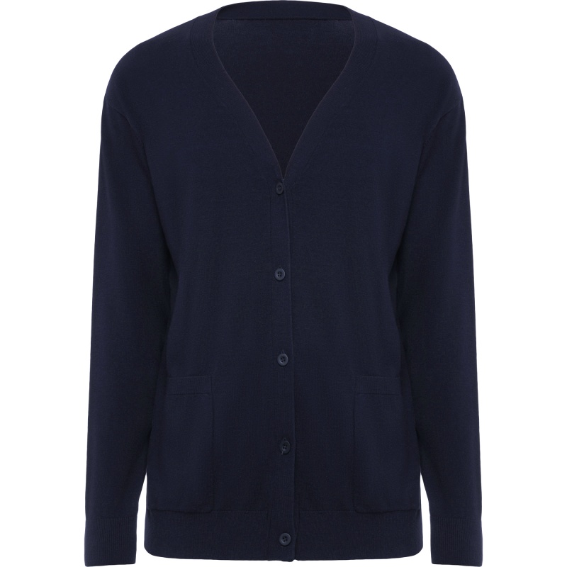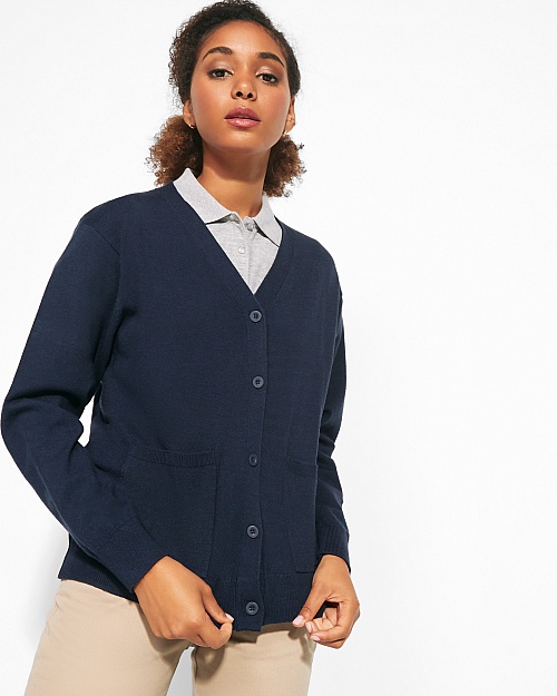 Damska kurtka z dekoltem w serek. Miękka dzianina. Zapinana po środku na pięć guzików w tym samym kolorze. Dwie naszyte kieszenie. Ściągacze przy nadgarstkach i w pasie z dzianiny prążkowanej.