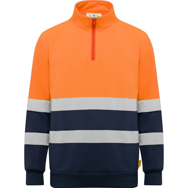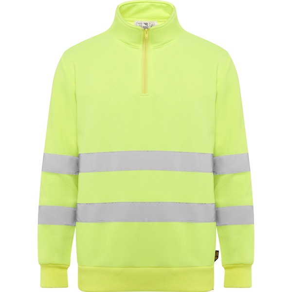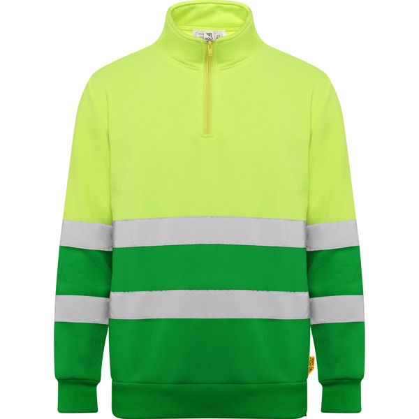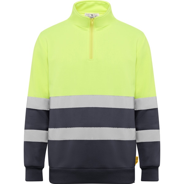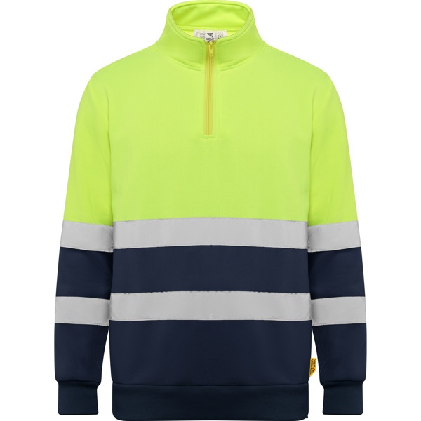 Bluza o wysokiej widoczności z zamkiem błyskawicznym i wysokim kołnierzem z osłoną podbródka i ściągaczem. Wzmocniona osłona szwów po wewnętrznej stronie kołnierza. Poziome paski odblaskowe na tułowiu i rękawach. Ściągacze 1x1 na mankietach i u dołu.