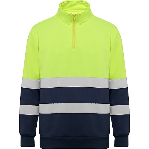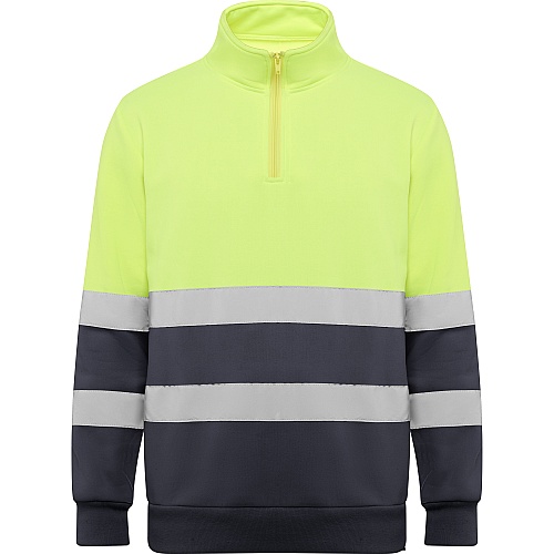 Bluza o wysokiej widoczności z zamkiem błyskawicznym i wysokim kołnierzem z osłoną podbródka i ściągaczem. Wzmocniona osłona szwów po wewnętrznej stronie kołnierza. Poziome paski odblaskowe na tułowiu i rękawach. Ściągacze 1x1 na mankietach i u dołu.