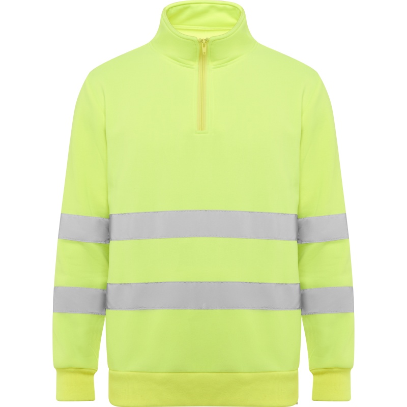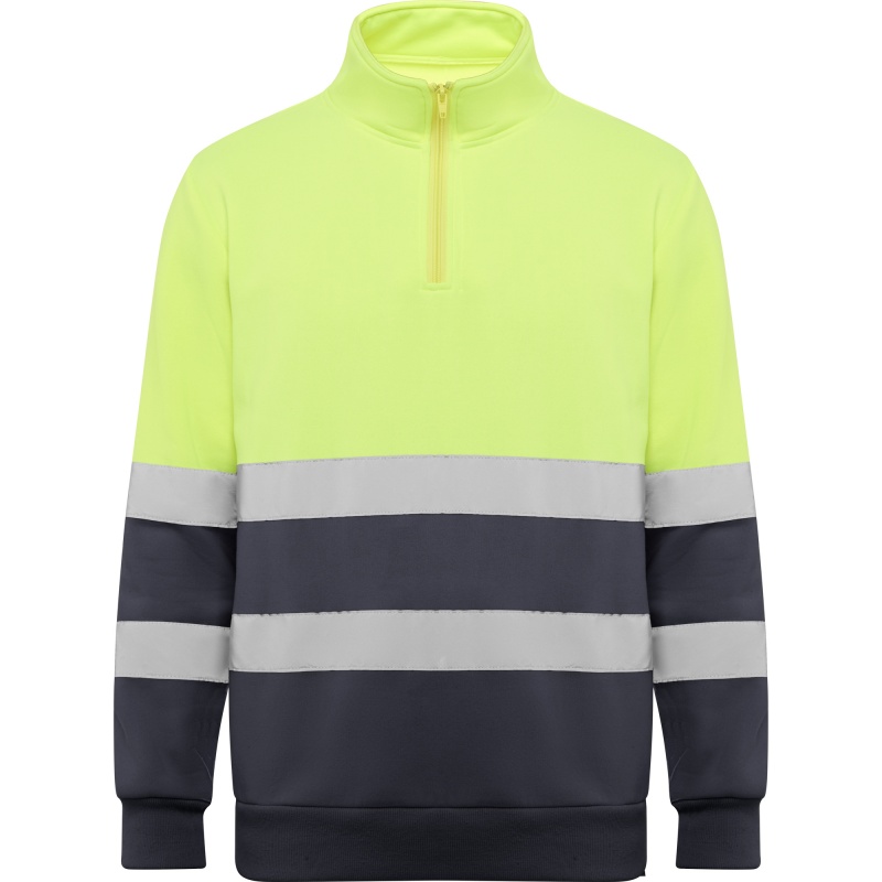 Bluza o wysokiej widoczności z zamkiem błyskawicznym i wysokim kołnierzem z osłoną podbródka i ściągaczem. Wzmocniona osłona szwów po wewnętrznej stronie kołnierza. Poziome paski odblaskowe na tułowiu i rękawach. Ściągacze 1x1 na mankietach i u dołu.