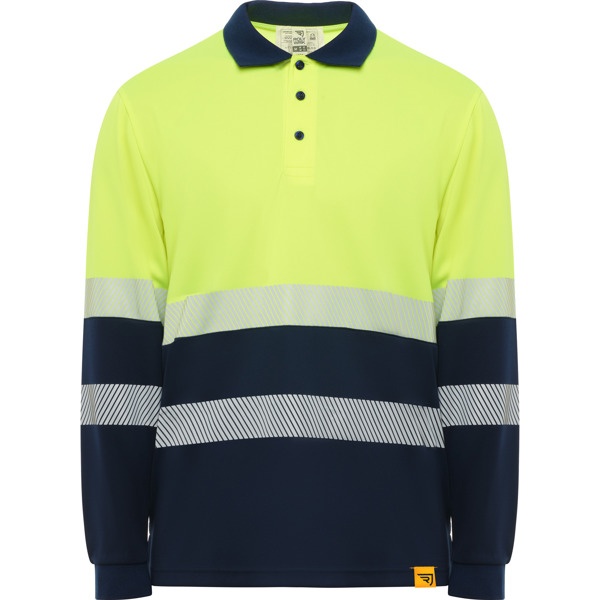 Polo techniczne widoczne z daleka z długim rękawem · Dwa dzielone pasy odblaskowe na piersiach i na plecach. · Klapa z 3 kontrastującymi guzikami. · Kołnierz i zakończenia rękawów z dzianiny prążkowanej 1x1. · Materiał odporny na zaciągnięcia i łatwo schnący. · Opcjonalna kieszeń.
