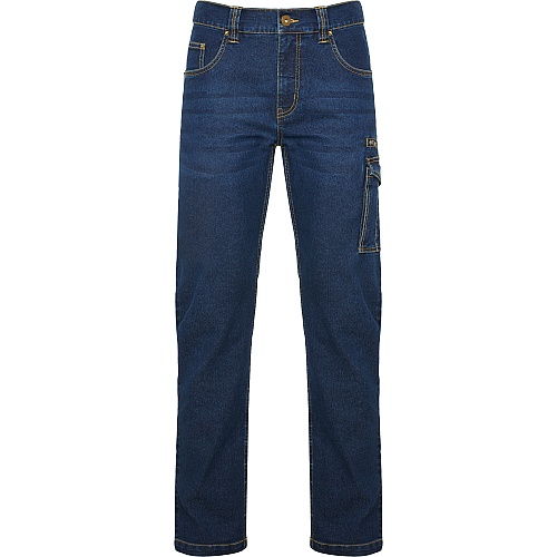 Dżinsowe spodnie z wieloma kieszeniami. · Zapinane na metalowy zamek i guzik. · Szlufki na pasek. · Kieszeń boczna po lewej stronie z mieszkiem, klapką i zapięciem na rzep. · Boczna kieszeń po lewej stronie zamykana na zamek. · Wąska podwójna kieszeń boczna po prawej stronie. · Kontrastujące szwy.