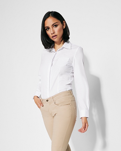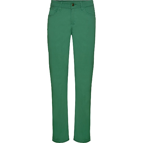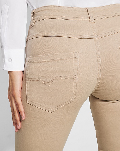 Damskie długie spodnie, z wygodnego i wytrzymałego materiału. · Dwie kieszenie z przodu, w prawej kieszonka na monety · Dwie tylne kieszenie · Szlufki na pasek · Canesú, imitacja dżinsu