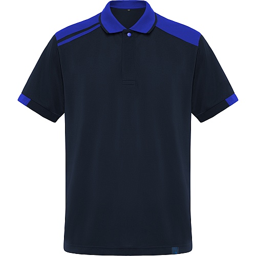 Polo z krótkim rękawem, wielokolorowe. Wykończenie i połowa rękawa ściągacz prążkowany 1x1. Klapa z 2 guzikami. Obwódka wzmocniona przy kołnierzu. Otwarte boki na dole. Kontrastujące fragmenty ramion i detale. Opcjonalna kontrastująca kieszeń.