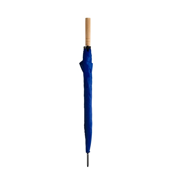 Parasol z drewnianą rączką i automatycznym otwieraniem. Czarne żebra i końcówki. Zapięcie na rzep. Wykonany z poliestru 190T.