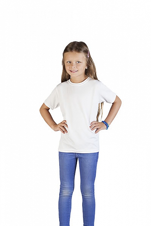 Specyfikacja koszulki: elastyczna, oddychająca, szybkoschnąca, chłonna, wykończenie antypilingowe, UV-protection. Koszulka ma nowoczesny krój, szwy boczne dla lepszego dopasowania. Kolor biały nadaje się do druku sublimacyjnego.